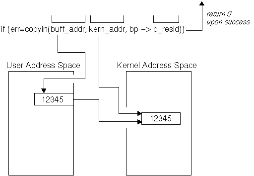 The code fragment sets up a condition statement that performs some tasks based on whether copyin executes successfully. Figure 18-7 shows how copyin copies data from user address space to kernel address space by using sample data.