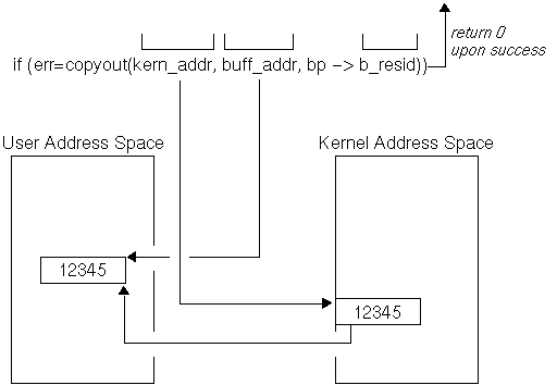 Figure 18-8 shows the results of copyout, based on the code fragment. As the figure shows, copyout copies the data from the protected kernel address space, starting at the address specified by kern_addr to the unprotected user address space specified by buff_addr. The number of bytes is indicated by the b_resid member. The figure also shows that copyout returns the value zero (0) upon successful completion. If the address in kernel address space could not be accessed or if the number of bytes to copy is invalid, copyout returns the error EFAULT. [Return to example]