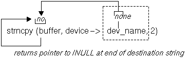 Figure 18-4 shows how strncpy copies a sample value in the code fragment. The interface copies the first two characters of the string none (the value pointed to by the dev_name member of the pointer to the device structure). The strncpy interface stops copying after it copies a null character or the number of characters specified in the third argument, whichever comes first.