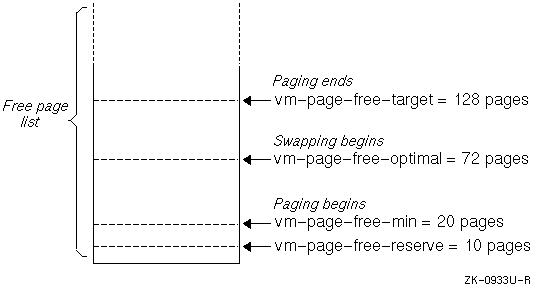 The virtual memory subsystem tries to maintain a reasonable number of pages on the free page list so that pages are available for use by processes. All pages are shared by virtual memory and the UBC. Four configuration attributes in the sysconfigtab file define the size of the free page list and thus control when paging and swapping occur: