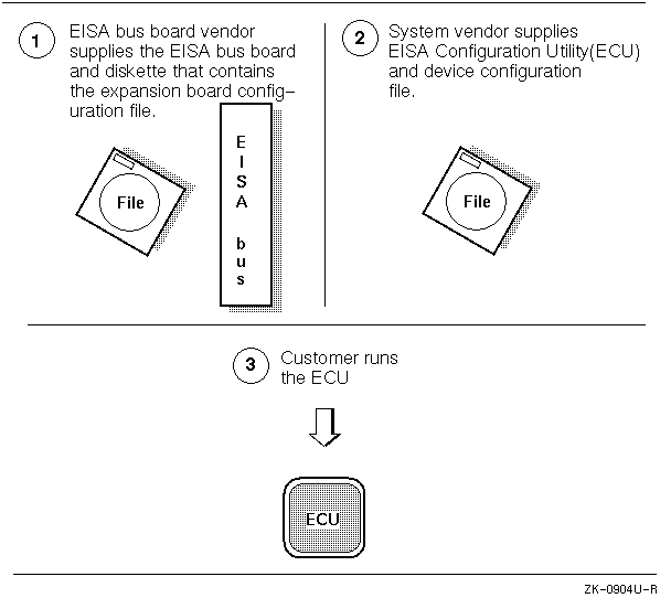 The customer runs the EISA Configuration Utility (ECU) whenever the configuration changes. The ECU reads the board configuration file and device configuration file for each device in the system and assigns resources based on the information in the device configuration file. The ECU resolves any conflicts and saves the configuration information in nonvolatile random-access memory (NVRAM).