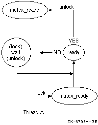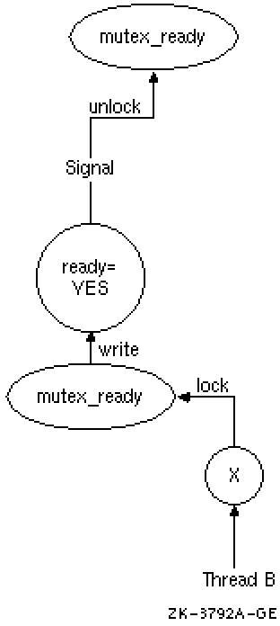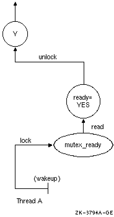 First, Thread A locks the mutex named mutex_ready that is associated with the shared variable named ready. Then it reads the value in ready. This test is called the predicate. If the predicate indicates that Thread B has finished Task X, then Thread A can unlock the mutex and proceed with Task Y. If the predicate indicates that Thread B has not yet finished Task X, however, then Thread A waits for the predicate to change by calling the pthread_cond_wait routine. This automatically unlocks the mutex, allowing Thread B to lock the mutex when it has finished Task X. Thread B updates the shared data (predicate) to the state Thread A is waiting for and signals the condition variable by calling the pthread_cond_signal routine (see Figure 2-3).