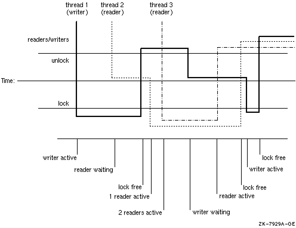 When both readers and writers are waiting for access at the same time, the readers are given precedence when the write lock is released. Read precedence favors concurrency because it potentially allows many threads to accomplish work simultaneously. Figure 4-1 illustrates the lock behavior on three threads (one writer and two readers) competing for the same memory object.