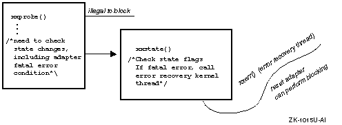 Figure 6-1 shows one example of the previously described situations. As the figure shows, a device driver must check a number of device state changes. One of these device state changes checks for an adapter fatal error condition. If the fatal error condition occurs, the driver must reset the adapter. The code that resets the adapter must block to accomplish the adapter reset operation. Furthermore, the only time this error can occur is during a device interrupt. It is not legal to block in an interrupt service interface. Therefore, the figure shows that the interrupt service interface for the driver calls an xxstate interface that handles all of the state changes. This interface creates a kernel thread called xxerr that starts up when the adapter becomes operational. The job of this kernel thread is to reset the adapter when a fatal error occurs. Note that it is legal for this kernel thread to perform blocking operations.