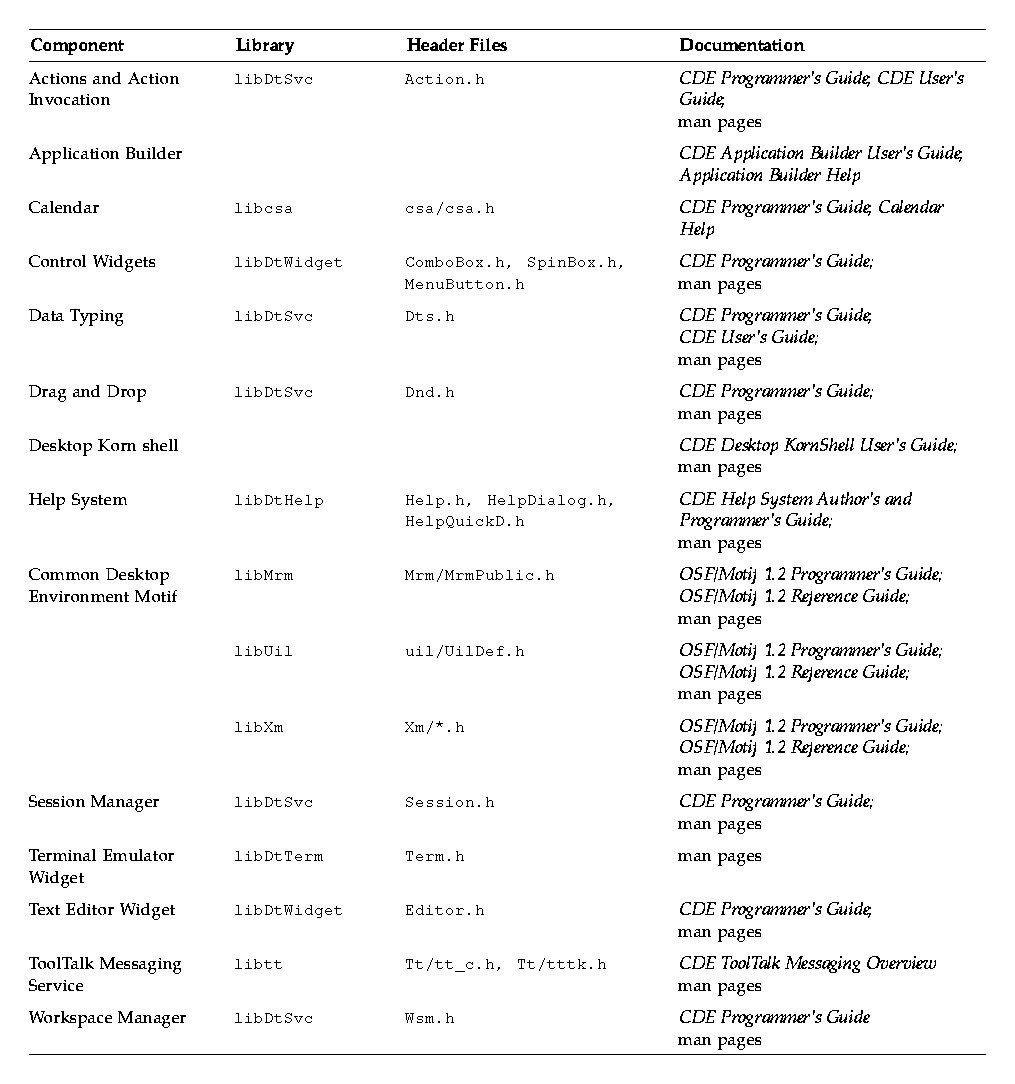 This appendix alphabetically lists all the CDE development environment components and guidelines, along with any associated library and header files, and provides references to associated documentation. In addition to the documentation listed, all components provide man pages, which are located in the /usr/dt/man directory. All header files are located in the Dt subdirectory of /usr/dt/include unless otherwise noted.