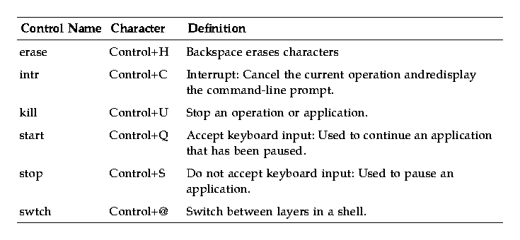 where name is the control, and C is the character. (^ is another way of expressing Control.) For example, the default value of ttyModes describing the preceding list is: