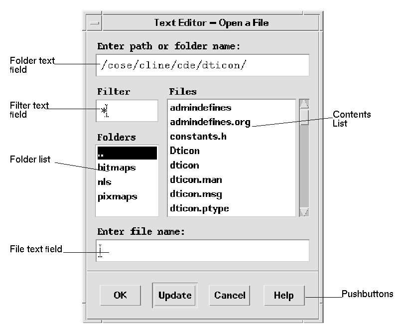 When the file selection dialog box is used to choose an existing directory (for example, to install a set of files into the chosen directory) or to specify a new directory, the command button should be given an appropriate label, such as Install, Choose, Create, or OK. If this button is activated while the appropriate directory is selected in the contents list, the directory is utilized by the application and the file selection box is dismissed. See link.