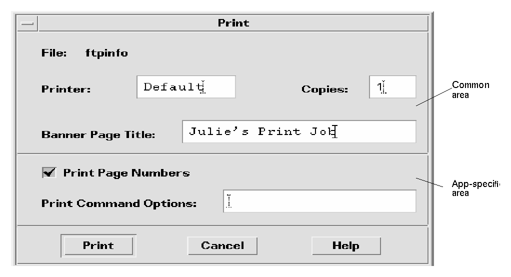 Applications are expected to provide many different types of printing functions and capabilities. This section provides guidelines for the most commonly used types of print options so that appearance and behavior for these items is consistent across applications. These common items are grouped into a common area that is located in the top portion of the print dialog. Figure 7-5 shows a typical print dialog. The common area is the area above the separator line.