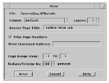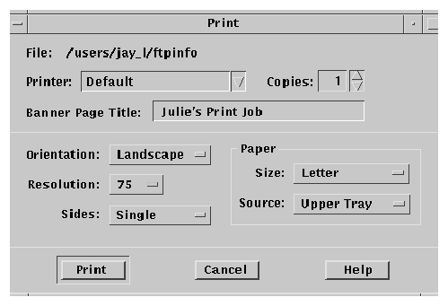 These are guidelines for a common look and feel print dialog box, which may be used wherever a print action is available. The print dialog is not a widget. Developers are encouraged to use these guidelines as a starting point and to add functionality as appropriate for their applications. It is important, however, to remember that users expect consistency from one print dialog to another; therefore, the common area should be left as unchanged as possible. Use a print dialog box whenever users would want to select options for printing a file, a selection, or other type of object. If your application supports printing, you should use a print dialog box, and you may provide an optional nondialog method of printing directly, that is, "silent" printing.
