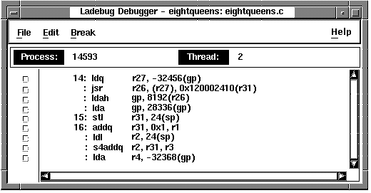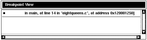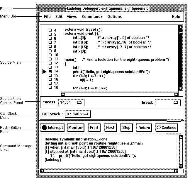 When you start the debugger as explained in Section 3.1, the Source View is initially empty. Figure 2-1 shows the Source View after a program has been brought under debugger control (by directing the debugger to run a specific image, in this example, eightqueens).