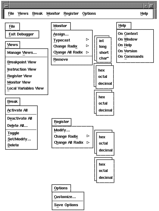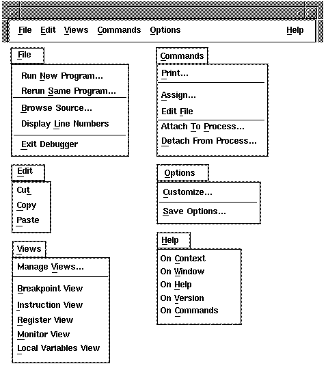 Context-sensitive pop-up menus in debugger windows and views list common operations associated with your location: when you click on MB3, the menu lists actions for the text you have selected, the source line at which you are pointing, or the window pane in which you are working. For more information about using context-sensitive pop-up menus (see Section 2.3).