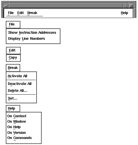 The annotation area is at the left side of the source pane and contains the breakpoint toggles and current location pointer. If you press MB3 while your mouse pointer rests in the annotation area of the source pane, a pop-up menu with the items in Table 2-8 appears.