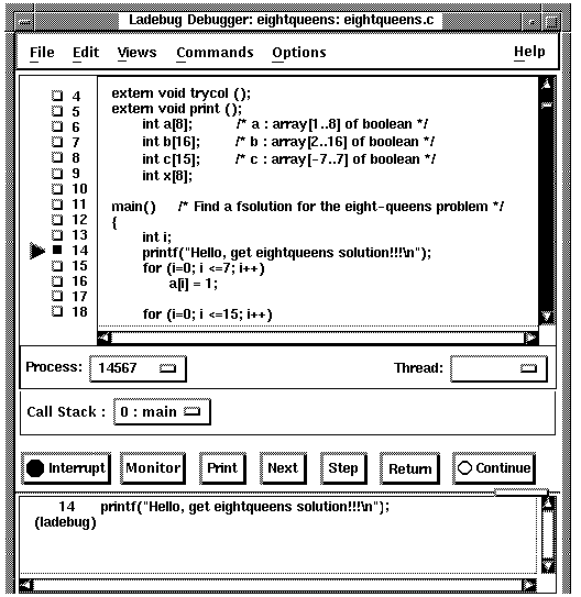 If your program does not terminate and you suspect that it is looping, click on the Interrupt button. The source display will show where you interrupted program execution, and the Call Stack menu will identify the sequence of routine calls at that point (see Section 4.3.1).