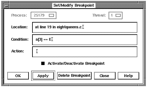 The following procedure modifies a conditional breakpoint; it can be used to change the location or condition associated with an existing conditional breakpoint, or to change an unqualified breakpoint into a conditional breakpoint: