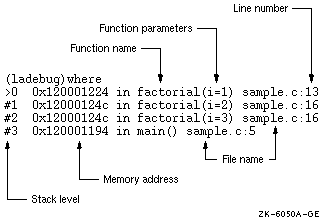 As explained in Chapter 7, the stack trace lists the active functions in the program you are debugging. Figure 8-1 shows the elements of a stack trace that the debugger displays when you enter a where command.