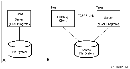Ladebug supports remote debugging in various client/server configurations. Figure 21-1 shows two configurations that use a single file system.