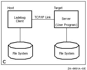 Remote debugging with Ladebug uses a client/server model. In this model, the host system, or client, initiates a connection to the target hardware and server software, which processes client requests.
