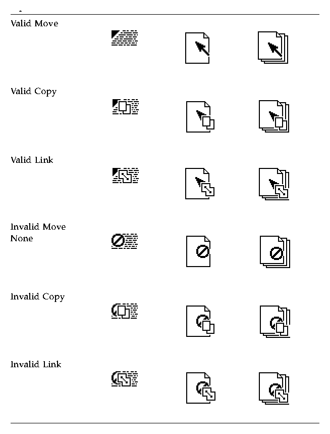 In the Common Desktop Environment, there are three operations that can be associated with the drag icon. These operations are explained in "Parts of a Drag Icon." The drag icon has alternate graphics, supplied as part of the desktop, used to indicate to the user when the operation is a copy or link. The default operation, move, requires no alternate icon graphics.