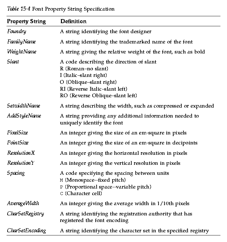 A font is specified by listing fourteen different characteristics, separated by dashes (-). This is called the X Logical Font Description (XLFD). In some cases, a property in the list can be replaced by a * wildcard, and a character within a property can be replaced by a ? wildcard. Table 15-4 lists font property string specifications.