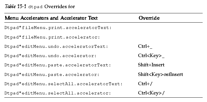 This chapter also describes how to specify style translations for DtEditor widget applications such as the desktop text editor (dtpad) and Mailer (dtmail), and alternates for DtEditor widget application menu accelerators that conflict with these translations.