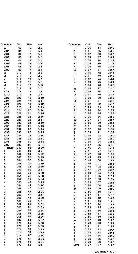 Figure C-1 shows the ASCII character set. Each character's octal, decimal, and hexadecimal value is shown.