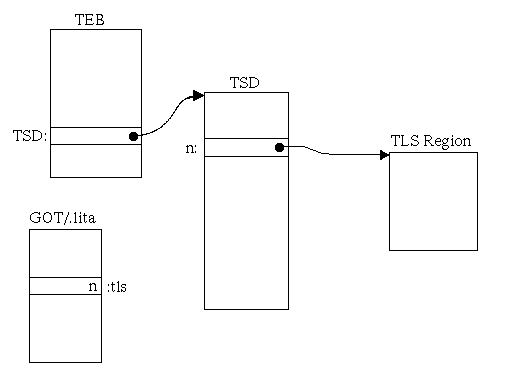 Structures outside the object file are used to reference TLS data. The Thread Environment Block (TEB) is an architected structure provided by system libraries. One of the fields in the TEB is the address of the Thread Specific Data (TSD) array, which contains pointers into the TLS region. Each object containing TLS will be allocated one or more TSD entries. In each thread, the TSD entries will contain the address of the start of a region of that thread's TLS area.